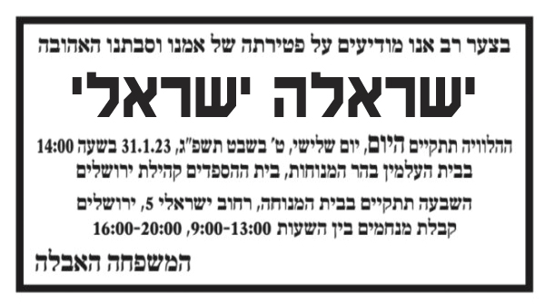 ההלוויה תתקיים ביום שני 24/11/2025 בשעה 11:00